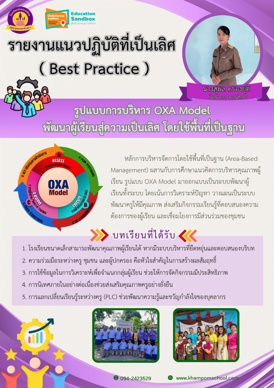 โรงเรียนได้นำหลักการบริหารจัดการโดยใช้พื้นที่เป็นฐาน (Area-Based Management) ผสานกับการศึกษาแนวคิดการบริหารคุณภาพผู้เรียนจึงนำรูปแบบ OXA Model มาออกแบบเป็นระบบพัฒนาผู้เรียนทั้งระบบ โดยเน้นการวิเคราะห์ปัญหา วางแผนเป็นระบบ พัฒนาครูให้มีคุณภาพ ส่งเสริมกิจกรรมเรียนรู้ที่ตอบสนองความต้องการของผู้เรียน และเชื่อมโยงการมีส่วนร่วมของชุมชน