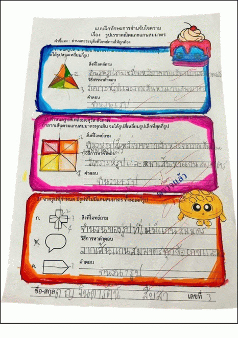 ผลลัพธ์ต่อโรงเรียน : ๑) มีนวัตกรรมที่มีประสิทธิภาพในการส่งเสริมทักษะการคิดทางคณิตศาสตร์และทักษะการอ่านจับใจความ เรื่อง รูปเรขาคณิตและแกนสมมาตร ชั้นประถมศึกษาปีที่ ๓