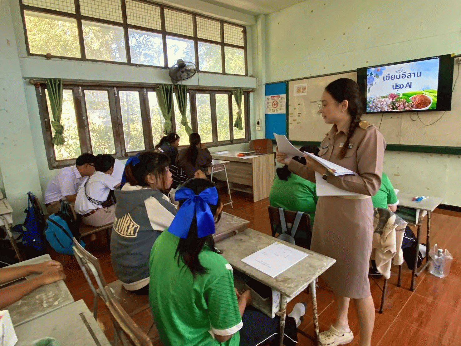 ด้วยเหตุผลเหล่านี้ ผู้จัดทำจึงได้พัฒนาการเรียนรู้ภาษาไทยเพื่อการเขียนสื่อสารเชิงสร้างสรรค์โดยใช้แนวคิด การเรียนรู้เชิงรุก (Active learning) ร่วมกับเทคนิค Prompt Engineering และภูมิปัญญาอาหารอีสาน “เขียนอีสาน ปรุง AI” เพื่อเสริมสร้างทักษะการใช้ภาษา การฟัง การเขียน และการสื่อสารของนักเรียนผ่าน การเรียนรู้ ที่มีความท้าทาย และมีปฏิสัมพันธ์สูง การจัดการเรียนการสอนครั้งนี้ออกแบบให้ผู้เรียนได้เรียนรู้เรื่องราวผ่านรูปภาพ โดยการฝึกตั้งคำถามจากรูปภาพว่า ใคร ทำอะไร ที่ไหน อย่างไร ฝึกแต่งประโยคง่ายๆไปสู่การเขียนเล่าเรื่องจากภาพ และสื่อสารโต้ตอบในสถานการณ์จำลองที่เกี่ยวข้องกับการประกอบอาหาร ทำให้ผู้เรียนได้พัฒนาทักษะภาษาอย่างรอบด้านและเกิดความมั่นใจมากขึ้น เมื่อนักเรียนแต่งประโยคได้แล้วยังสามารถสร้างคำสั่งหรือ prompt เพื่อให้สร้างรูปภาพที่นักเรียนต้องการจากแอพพลิเคชัน Gemini และ ChatGPT เมื่อได้ภาพที่ต้องการจึงนำมาเขียนเล่าเรื่องจากภาพ และสร้างผลงานเป็น E-Book หรือ Flipbook ผ่าน แอพพลิเคชั่น CANVA และ Heyzine Flipbooks