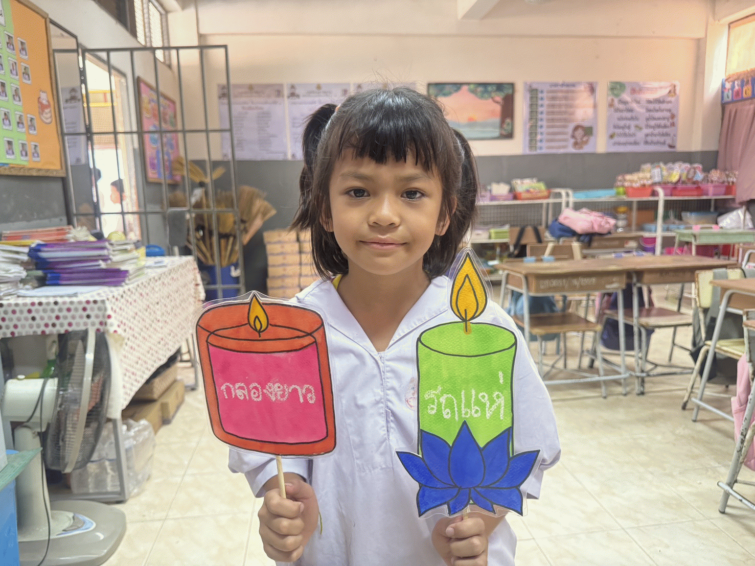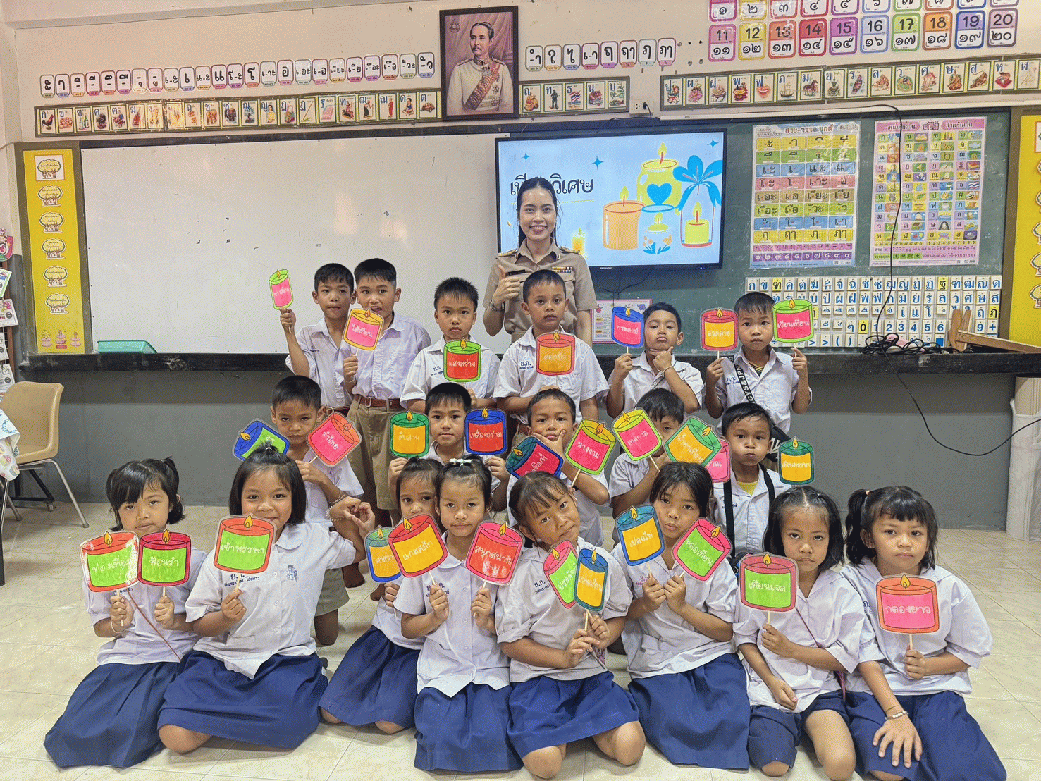 ผลลัพธ์ต่อนักเรียน1) นักเรียนมีความสามารถในการจำคำศัพท์ การสะกดคำ และการอ่านออกเสียงได้ดีขึ้นอย่างชัดเจน เนื่องจากชิ้นงานสื่อบัตรคำ ช่วยสร้างภาพจำ ทำให้คำศัพท์ที่เป็นนามธรรมกลายเป็นสิ่งที่จับต้องและจดจำได้ง่ายขึ้น 2) นักเรียนได้พัฒนากล้ามเนื้อมัดเล็กผ่านการจับสีเทียนและพู่กันระบายสีน้ำ รวมถึงได้แสดงออกถึงความคิดสร้างสรรค์ผ่านชิ้นงานของตนเอง 3) นักเรียนมีสมาธิจดจ่อกับการเรียนได้นานขึ้น มีความกระตือรือร้นและสนุกสนานกับการค้นหา “คำศัพท์ที่ซ่อนอยู่” นอกจากนี้ยังเกิดความตระหนักรู้ รัก และภาคภูมิใจใน “เทียนอุบล” ซึ่งเป็นรากเหง้าวัฒนธรรมของท้องถิ่นตนเอง