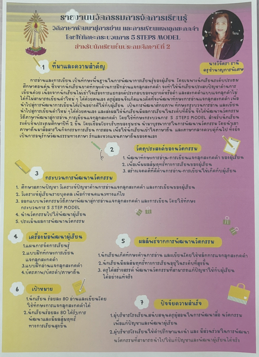 นวัตกรรมการจัดการเรียนรู้ วิถีภาษาพัฒนาสู่การอ่านและการเขียนแจกลูกสะกดคำ โดยใช้ทักษะกระบวนการ 5 STEPS MODEL สำหรับนักเรียนชั้นประถมศึกษาปีที่ 2
