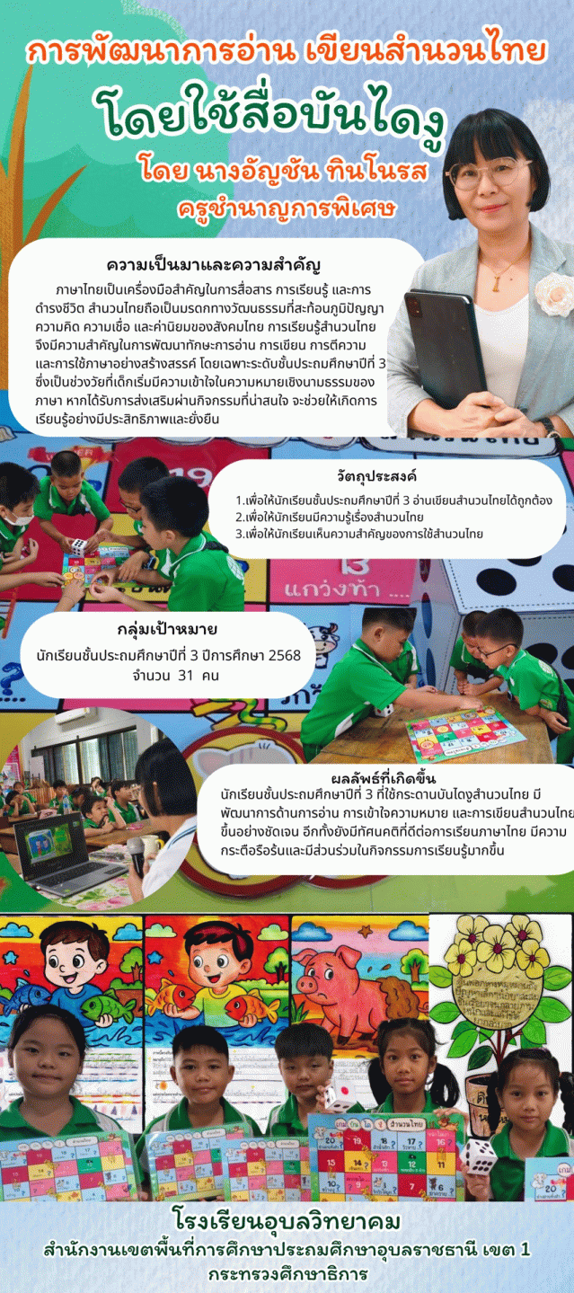 ผลลัพธ์ต่อนักเรียน• นักเรียนมีความรู้ ความเข้าใจเกี่ยวกับความหมายของสำนวนไทยเพิ่มขึ้น • นักเรียนสามารถใช้สำนวนไทยในการสื่อสารหรือเขียนประโยคได้ถูกต้องเหมาะสม • นักเรียนมีพัฒนาการด้านทักษะการอ่านจับใจความ การเขียนประโยค และการใช้ภาษาไทยอย่างสร้างสรรค์ • นักเรียนมีเจตคติที่ดีต่อการเรียนภาษาไทย มีความกระตือรือร้น สนุกกับการเรียนรู้ • นักเรียนสามารถทำงานร่วมกับผู้อื่นได้ มีความรับผิดชอบและกล้าแสดงความคิดเห็น