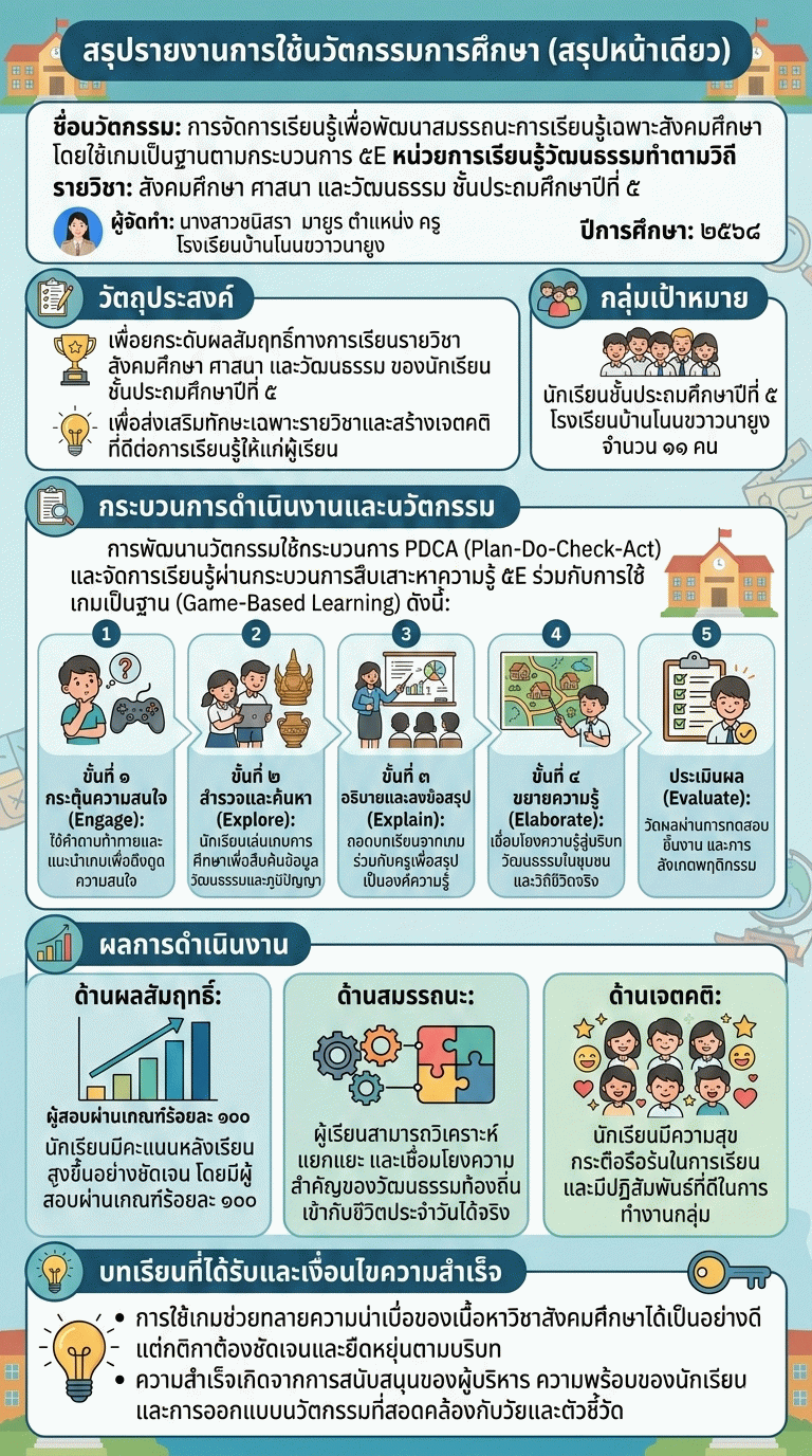 ด้วยเหตุนี้ ผู้จัดทำจึงได้พัฒนานวัตกรรมการจัดการเรียนรู้โดยใช้เกมเป็นฐานตามกระบวนการ 5E ในหน่วยการเรียนรู้ “วัฒนธรรมทำตามวิถี” เพื่อเสริมสร้างสมรรถนะด้านการเรียนรู้เฉพาะวิชาสังคมศึกษา ให้แก่ผู้เรียนระดับชั้นประถมศึกษาปีที่ 5 อย่างมีประสิทธิภาพ และส่งเสริมให้เกิดการเรียนรู้อย่างยั่งยืนและ มีความสุข