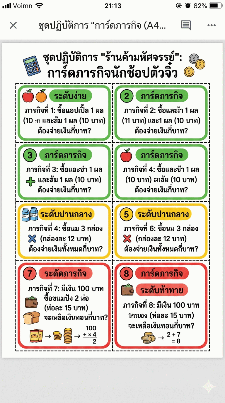 ผลลัพธ์ต่อนักเรียน• ทักษะการคิดคำนวณ: นักเรียนมีความแม่นยำในการบวก ลบ คูณ และหารระคนเพิ่มขึ้น โดยสามารถวิเคราะห์โจทย์ปัญหาที่ซับซ้อนได้อย่างเป็นลำดับขั้นตอน • เจตคติและการเรียนรู้: นักเรียนเปลี่ยนทัศนคติต่อวิชาคณิตศาสตร์จาก "เรื่องยาก" เป็น "เรื่องสนุก" มีความกระตือรือร้นในการเรียนแบบ Active Learning และกล้าแสดงออก • ทักษะชีวิต (Life Skills): นักเรียนได้ฝึกทักษะการใช้เงินในชีวิตจริง การรู้จักค่าของเงิน การทอนเงินที่ถูกต้อง และการทำงานร่วมกับผู้อื่นในฐานะผู้ซื้อและผู้ขาย