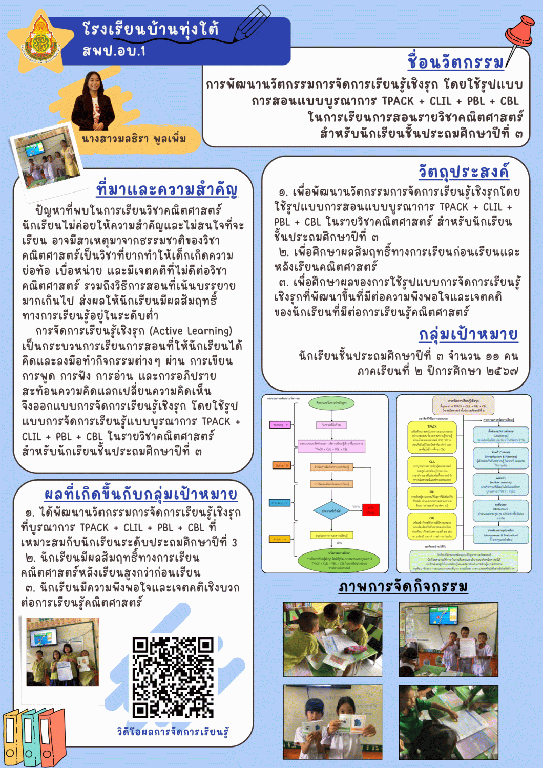 การพัฒนานวัตกรรมการจัดการเรียนรู้เชิงรุก โดยใช้รูปแบบการสอนแบบบูรณาการ TPACK + CLIL + PBL + CBL ในการเรียนการสอนรายวิชาคณิตศาสตร์ สำหรับนักเรียนชั้นประถมศึกษาปีที่ ๓ ผู้จัดทำนวัตกรรม