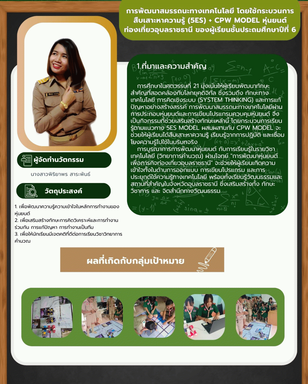 การพัฒนาสมรรถนะทางเทคโนโลยี โดยใช้กระบวนการสืบเสาะหาความรู้ (5Es) + CPW Model หุ่นยนต์ท่องเที่ยวอุบลราชธานี ของผู้เรียนชั้นประถมศึกษาปีที่ 6