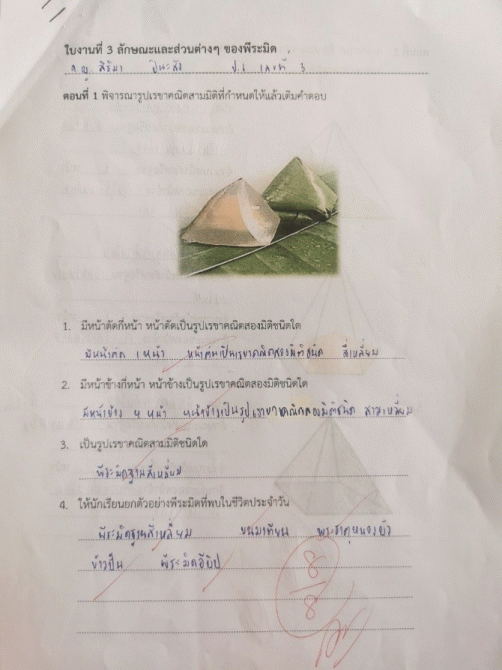 ผลลัพธ์ต่อนักเรียนผู้เรียนมีผลสัมฤทธิ์ทางการเรียนรายวิชา คณิตศาสตร์ ที่สูงขึ้น มีทักษะในกระบวนการทางคณิตศาสตร์ ในการเชื่อมโยงลักษณะ การคิดวเคราะห์ของรูปเรขาคณิตสามมิติแต่ละชนิดกับสิ่งที่พบในชีวิตประจำวัน มีคุณลักษณะอันพึงประสงค์ในการเรียนคณิตศาสตร์และมีเจตคติที่ดีต่อรายวิชาคณิตศาสตร์