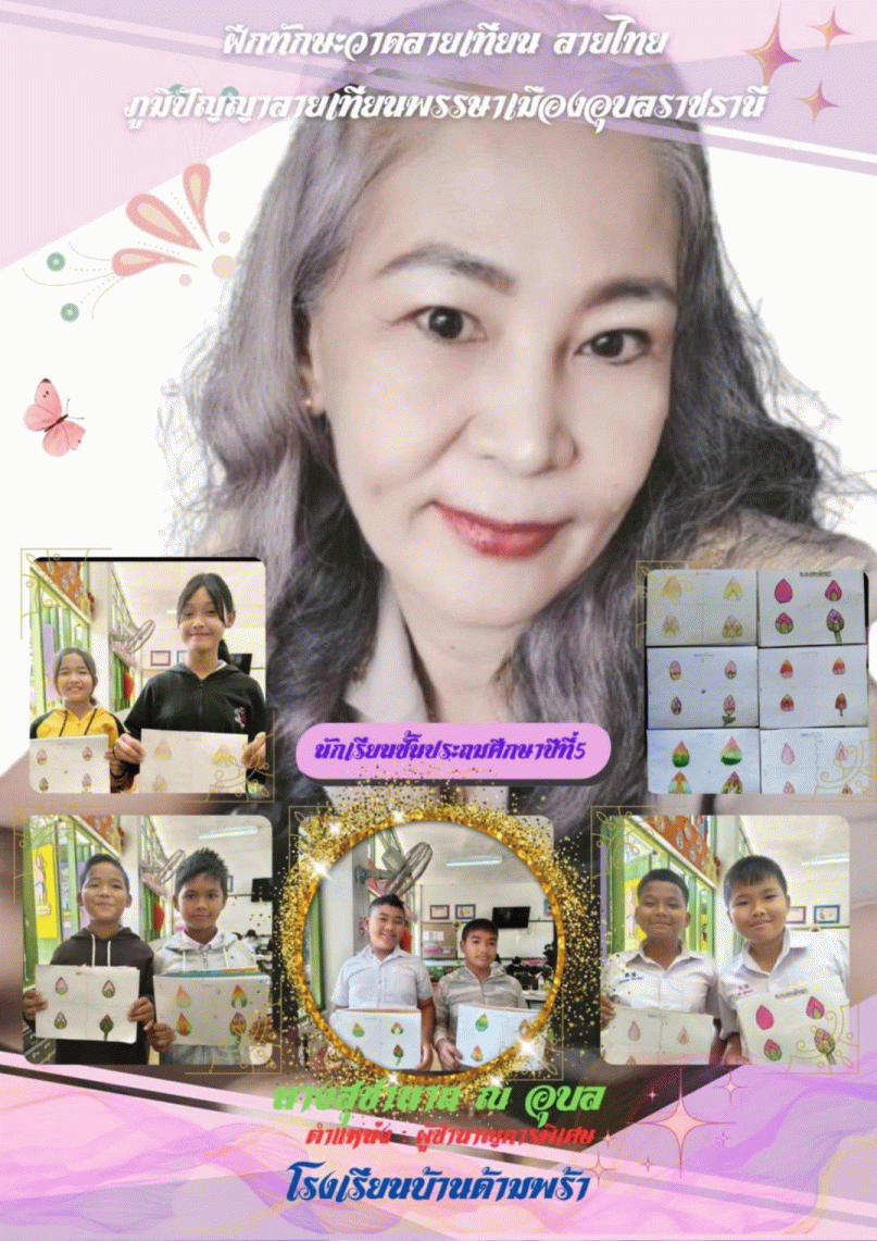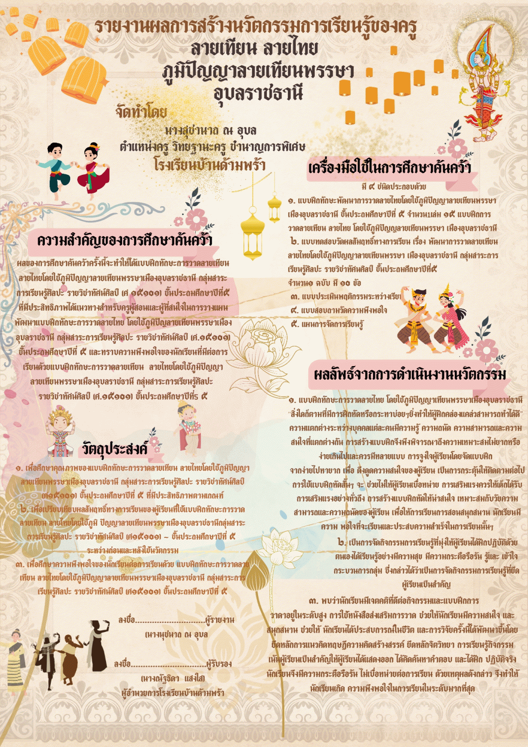 ผลลัพธ์ต่อนักเรียน1.ด้านทักษะการวาดลายไทยนักเรียนมีพัฒนาการวาดลายไทยดีขึ้นอย่างเห็นได้ชัด สามารถจับลักษระเด่นของลายเทียนลายดอกบัวตูมได้อย่างแม่นยำ 2.ด้านความรู้และความเข้าใจในภมิปัญญาท้องถิ่น(ลายเทียนพรรษาเมืองอุบลราชธานี 3.ด้านทัศนคติและเจตคติ4.ด้านการเรียนรู้ด้วยดนเองและทักษะศตวรรษที่21 5.ด้านการประเมินผล