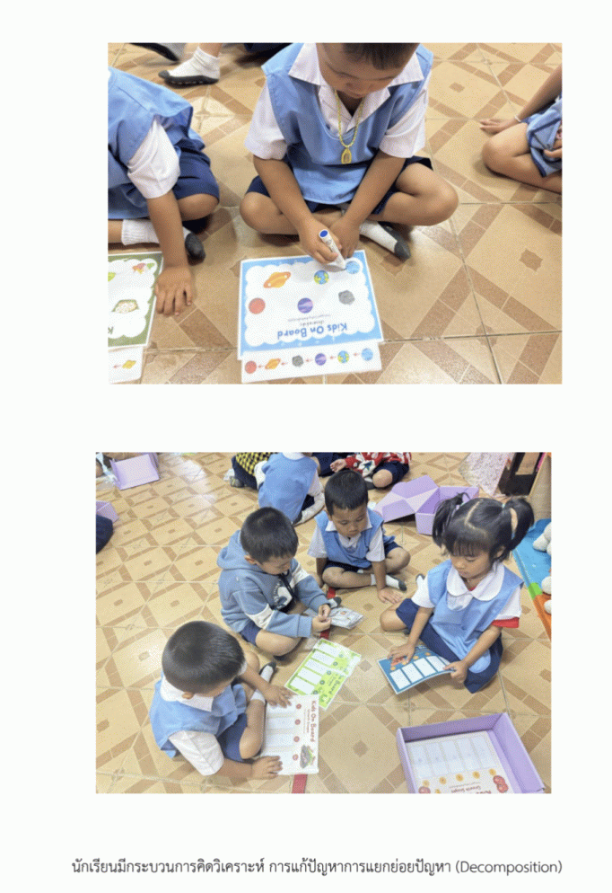 ผลลัพธ์ต่อนักเรียนนักเรียนชั้นอนุบาลปีที่ 2/2 พัฒนาทักษะการคิดเชิงคำนวณและการแก้ปัญหาได้ดีขึ้น โดยไม่ต้องใช้อุปกรณ์อิเล็กทรอนิกส์ นักเรียนสามารถเข้าใจขั้นตอนการทำงานและลำดับการกระทำผ่านกิจกรรมที่เป็นรูปธรรม ทำให้พวกเขามีทักษะการคิดอย่างเป็นระบบ มีความคิดสร้างสรรค์ในการแก้ไขปัญหา และกล้าที่จะแสดงออกความคิดเห็นในกระบวนการเรียนรู้