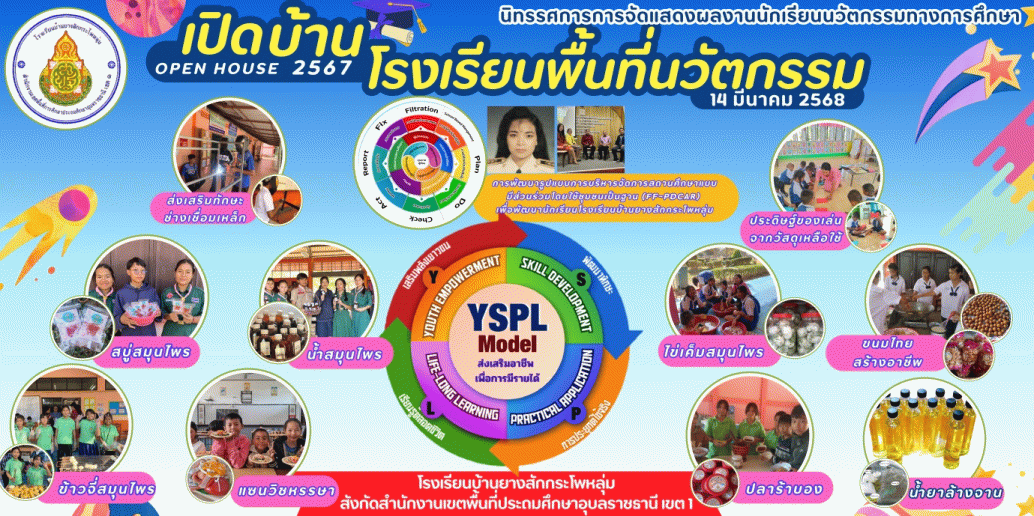 นวัตกรรมส่งเสริมอาชีพเพื่อการมีรายได้ ของนักเรียนจะดำเนินการออกแบบและพัฒนาภายใต้ YSPL Model ( YangSakaPhoLume Model) โดยเน้นการพัฒนาศักยภาพและการเตรียมความพร้อมสู่โลกการทำงาน แบบจำลองนี้แบ่งเป็น 4 ขั้นตอนหลัก: Y - Youth Empowerment (เสริมพลังเยาวชน): การสร้างแรงบันดาลใจและการค้นพบตนเอง จากการทำกิจกรรมฝึกทักษะอาชีพ เพื่อให้นักเรียนได้เรียนรู้จุดแข็งและจุดอ่อนของตนเอง และค้นหาอาชีพที่เหมาะสม การพัฒนาทักษะชีวิต เน้นการฝึกฝนทักษะสำคัญๆ เช่น การทำงานเป็นทีม, การสื่อสาร, การบริหารเวลา, การจัดการความเครียด, และการเรียนรู้ตลอดชีวิต ซึ่งเป็นทักษะที่จำเป็นต่อการทำงานในทุกอาชีพ S - Skill Development (พัฒนาทักษะ): พัฒนาทักษะอาชีพเพื่อการมีรายได้ จากเรียนรู้ประสบการณ์การทำงานจริง และสร้างประสบการณ์ในการทำงาน เพื่อเตรียมความพร้อมสู่โลกการทำงาน P - Practical Application (การประยุกต์ใช้จริง): นักเรียนได้ลองทำงานจริงในสภาพแวดล้อมที่จำลองมาจากสถานที่ทำงานจริง เพื่อฝึกฝนทักษะการทำงานและการแก้ปัญหาในสถานการณ์จริง ให้นักเรียนได้ทำการขายสินค้าหรือบริการที่นักเรียนได้ทำขึ้น ให้คำปรึกษาและติดตามผลการพัฒนาของนักเรียนอย่างต่อเนื่อง เพื่อให้การสนับสนุนและแก้ไขปัญหาต่างๆ L - Life-Long Learning (การเรียนรู้ตลอดชีวิต): ส่งเสริมให้นักเรียนเรียนรู้ด้วยตนเองอย่างต่อเนื่อง โดยการเข้าถึงแหล่งข้อมูลต่างๆ การพัฒนาทักษะการเรียนรู้ ฝึกฝนทักษะการเรียนรู้ เช่น การวิเคราะห์ข้อมูล, การสังเคราะห์ข้อมูล, และการประเมินตนเอง เพื่อให้นักเรียนสามารถเรียนรู้ได้อย่างมีประสิทธิภาพตลอดชีวิต เตรียมความพร้อมให้นักเรียนสามารถปรับตัวและเรียนรู้สิ่งใหม่ๆ ได้อย่างต่อเนื่อง เพื่อให้สามารถทำงานได้ในทุกสภาพแวดล้อมและสามารถรับมือกับการเปลี่ยนแปลงของโลกการทำงานได้ โรงเรียนบ้านยางสักกระโพหลุ่ม ได้ดำเนินการเปิดบ้านโรงเรียนพื้นที่นวัตกรรมขึ้น ในวันที่ 14 มีนาคม พ.ศ. 2568 เพื่อให้นักเรียนได้แสดงนิทรรศการผลงานของนักเรียน โดยมีวัตถุประสงค์ ดังนี้๑. เพื่อให้ผู้เรียนได้เข้าร่วมกิจกรรมที่ส่งเสริมให้บรรลุตามเป้าหมาย วิสัยทัศน์ ปรัชญา และจุดเน้นของสถานศึกษา ๒. เพื่อเปิดโอกาสให้ผู้เรียนหาประสบการณ์จากการปฏิบัติจริง เรียนรู้การทำงานเป็นกลุ่ม ฝึกตนเองให้มีความรับผิดชอบ ตรงต่อเวลา ๓. เพื่อฝึกให้ผู้เรียนได้นำความรู้ความสามารถไปใช้เพื่อพัฒนาตนเองด้านวิชาการและด้านอาชีพ ประกอบด้วย บูธด้านการบริหาร จำนวน ๑ บูธ และบูธทักษะอาชีพ ๑๐ บูธ รวม ๑๑ บูธ ดังนี้ ๑. บูธด้านการบริหารแบบมีส่วนร่วม FFPDCAR ๒. ขนมไทยสร้างรายไ