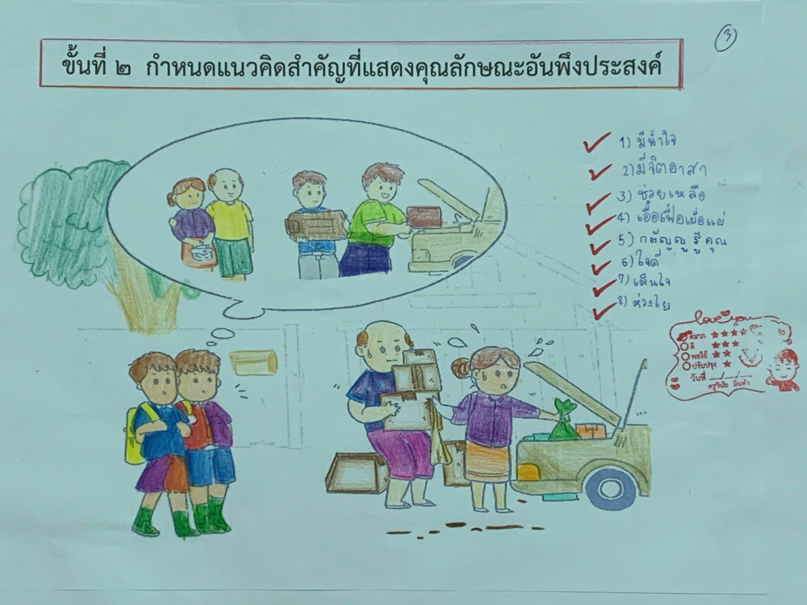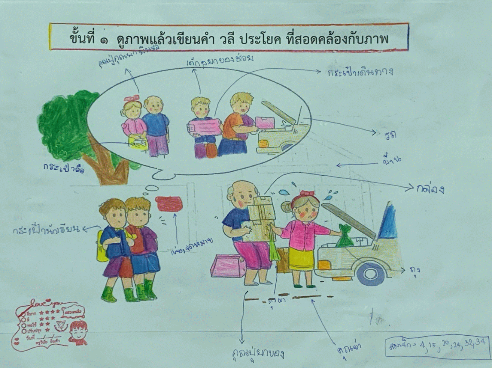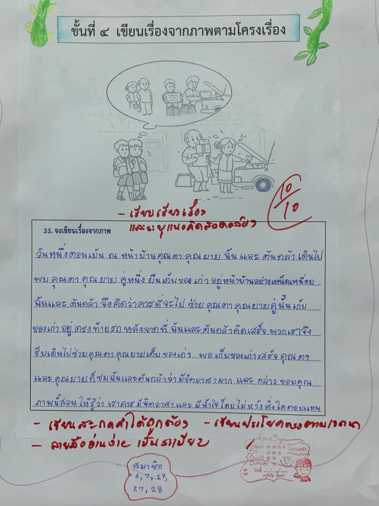 หลักการ แนวคิด ทฤษฎี ที่สอดคล้องกับกระบวนการเรียนรู้ ๕ Steps กระบวนการเรียนรู้ ๕ Steps เป็นนวัตกรรมที่พัฒนาขึ้นบนพื้นฐานของทฤษฎีการเรียนรู้แบบ Active Learning และทฤษฎีการเรียนรู้เชิงสร้างสรรค์ (Constructivism) ซึ่งเน้นให้ผู้เรียนสร้างความรู้ ด้วยตนเองผ่านกระบวนการคิด วิเคราะห์ และลงมือปฏิบัติ โดยมีครูเป็นผู้ชี้แนะและอำนวยความสะดวก การใช้ภาพเป็นสื่อกระตุ้นความคิดสร้างสรรค์ช่วยให้นักเรียนได้พัฒนาจินตนาการและความคิด เชิงสร้างสรรค์ กระบวนการเรียนรู้ 5 Steps ประกอบด้วย ขั้นที่ ๑ ดูภาพแล้วเขียนคำ วลี ประโยค ที่สอดคล้องกับภาพ เป้าหมายการเรียนรู้-----เพื่อให้นักเรียนมีทักษะการดูภาพอย่างมีมารยาท แล้วเขียนสิ่งที่เกี่ยวข้องกับภาพ ผลการเรียนรู้-------นักเรียนสามารถเขียนคำ วลี ประโยค ได้สอดคล้องกับภาพโดยเฉพาะพฤติกรรมเด่นของตัวละคร ในภาพ และสามารถปฏิบัติตนการมีมารยาทในการดูได้ คือ ตั้งใจดูด้วยความตั้งใจ ไม่ส่งเสียงดังรบกวนผู้อื่น และไม่พูดหรือเล่าเรื่องราวแทรกขณะที่ผู้อื่นกำลังดูอยู่ ขั้นที่ ๒ กำหนดแนวคิดสำคัญที่แสดงคุณลักษณะอันพึงประสงค์ เป้าหมายการเรียนรู้---เพื่อให้นักเรียนได้กำหนดคุณลักษณะอันพึงประสงค์/คุณธรรมที่สอดคล้องกับภาพ ผลการเรียนรู้------นักเรียนสามารถกำหนดคุณลักษณะอันพึงประสงค์ ๘ ประการ ได้แก่ ๑) รักชาติ ศาสน์ กษัตริย์ ๒) ซื่อสัตย์สุจริต ๓) มีวินัย ๔) ใฝ่เรียนรู้ ๕) อยู่อย่างพอเพียง ๖) มุ่งมั่นในการทำงาน ๗) รักความเป็นไทย ๘) มีจิตสาธารณะ ตามหลักสูตรแกนกลางการศึกษาขั้นพื้นฐาน พ.ศ.๒๕๕๑ และคุณธรรมอื่น ๆ ที่สอดคล้องกับภาพได้ นอกจากนี้นักเรียนได้ฝึกฝนสมรรถนะการคิด การสื่อสาร การทำงานเป็นกลุ่ม ดังนี้ สมรรถนะการคิด นักเรียนร่วมกันระดมความคิดเห็นเพื่อระบุ/กำหนดคุณลักษณะอันพึงประสงค์หรือคุณธรรมที่สอดคล้องกับภาพที่กำหนดเพื่อกำหนดเป็นแนวคิดสำคัญของการเขียนเรื่องจากภาพ สมรรถนะการสื่อสาร นักเรียนมีทักษะการนำเสนอผลงานที่เกิดจากการสร้างองค์ความรู้ด้วยตนเองโดยใช้เทคโนโลยีมาช่วยในการสื่อสาร และมีมารยาทในการพูด การทำงานเป็นกลุ่ม นักเรียนมีทักษะการทำงานเป็นกลุ่ม นักเรียนเก่ง กลาง อ่อน และเด็กพิเศษเรียนรวม ได้แลกเปลี่ยนเรียนรู้ซึ่งกันและกัน ขั้นที่ ๓ วางโครงเรื่องเพื่อจัดลำดับความคิด เป้าหมายการเรียนรู้------เพื่อให้นักเรียนวางโครงเรื่องอย่างเป็นระบบก่อนเขียนเรื่องจากภาพ ผลการเรียนรู้---------นักเรียนสามารถวางโครงเรื่องอย่างเป็นระบบก่อนเขียนเรื่องจากภาพ ดังนี้ ใคร ทำอะไร ที่ไหน เมื่อใด ผลเป็นอย่างไร ภาพนี้สอนให้รู