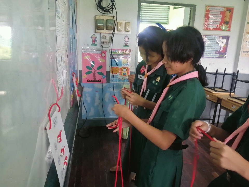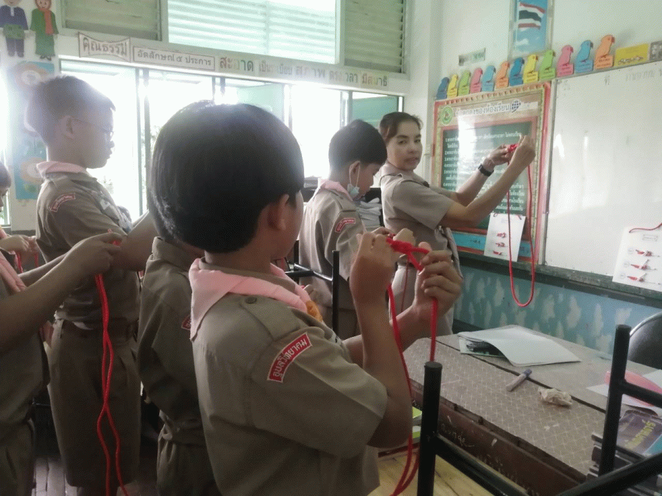 วัตถุประสงค์ 1. นักเรียนสามารถบอกความหมายของการผูกเงื่อนประมงได้ถูกต้อง 2. นักเรียนสามารถบอกขั้นตอนการผูกเงื่อนประมงได้ 3. นักเรียนสามารถบอกวัสดุอุปกรณ์ที่ใช้ทำเงื่อนประมงได้ 4. นักเรียนสามารถบอกประโยชน์การนำเงื่อนประมงไปใช้ในชีวิตประจำวันได้ กลุ่มเป้าหมาย นักเรียนชั้นประถมศึกษาปีที่ 5 ปีการศึกษา 2568 จำนวน 131 คน เครื่องมือที่ใช้ 1. คลิปการสอนการผูกเงื่อนประมง 2. หนังสืออ่านเสริมบทเรียนกิจกรรมพัฒนาผู้เรียน ชั้นประถมศึกษาปีที่ 5 เรื่อง สองพี่น้องก้องก้านเล่ม 1 ตอนก้องก้านเล่าเรื่องตกปลา 3. แบบประเมินการสังเกต ความสนใจ และความตั้งใจในการเข้าร่วมกิจกรรม 4. ประเมินผลงานของการผูกเงื่อนประมง กระบวนการพัฒนานวัตกรรม ขั้นที่ 1 P (Plan) 1. ศึกษาสภาพปัญหาและวิเคราะห์เนื้อหาเรื่องการผูกเงื่อนสำหรับนักเรียนชั้นประถมศึกษาปีที่ 5 2. ออกแบบ ขั้นตอน การการทำคลิปเพื่อใช้สอน 3. ศึกษา ออกแบบ หนังสืออ่านเสริมบทเรียนกิจกรรมพัฒนาผู้เรียน 4. กำหนดเกณฑ์การประเมินผล ขั้นที่ 2 D (Do) 1. จัดกิจกรรมการเรียนการสอนตามรูปแบบกระบวนการลูกเสือ 1. พิธีเปิดประชุมกอง ( ธงขึ้น สวดมนต์ สงบนิ่ง ตรวจ แยก ) 2. เกม 3. การสอนตามเนื้อหา - ดำเนินการจัดกิจกรรมการเรียนรู้โดยใช้คลิปการสอนการผูกเงื่อนประมง - ให้นักเรียนอ่านหนังสืออ่านเสริมบทเรียนกิจกรรมพัฒนาผู้เรียน ชั้นประถมศึกษาปีที่ 5 เรื่อง สองพี่น้องก้องก้านเล่ม 1 ตอนก้องก้านเล่าเรื่องตกปลา 4. การเล่าเรื่องสั้นที่เป็นคติ 5. พิธีปิดประชุมกอง - นัดหมายให้นักเรียนออกแบบกิจกรรมการผูกเงื่อนประมงที่นำไปสู่การประยุกต์ใช้ในชีวิตประจำวัน ขั้นที่ 3 C (Check) 1. ตรวจประเมินผลงานด้วยแบบประเมิน 2. รับฟังข้อเสนอแนะจากนักเรียน ขั้นที่ 4 A (Act) 1. ปรับปรุงแบบฝึกและกิจกรรมให้เหมาะสม 2. พัฒนากิจกรรมเสริม 3. สรุปผลและจัดทำรายงานเผยแพร่