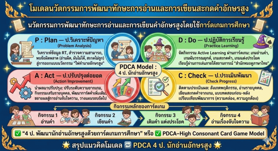 รายงานนวัตกรรมการพัฒนาทักษะการอ่านและการเขียนคำผันวรรณยุกต์อักษรสูง โดยใช้การ์ดเกมการศึกษา เรื่อง พยากรณ์ อักษรสูง สำหรับนักเรียนชั้นประถมศึกษาปีที่ ๑ โรงเรียนบ้านเสียม (เสียมทองวิทยาคาร) ผู้จัดทำนวัตกรรม นางสาวธิดารัตน์ เชิดทอง ครูผู้สอนกลุ่มสาระการเรียนรู้ภาษาไทย ชั้นประถมศึกษาปีที่ ๑ โรงเรียนบ้านเสียม (เสียมทองวิทยาคาร) ตำบลหัวดอน อำเภอเขื่องใน จังหวัดอุบลราชธานี ที่มาและความสำคัญ การเรียนการสอนภาษาไทยในระดับชั้นประถมศึกษาปีที่ ๑ พบว่านักเรียนจำนวนหนึ่งยังมีปัญหาในการอ่านและเขียนคำที่มี อักษรสูงและการผันวรรณยุกต์ เนื่องจากยังไม่เข้าใจหลักการประสมคำและตำแหน่งวรรณยุกต์อย่างถูกต้อง. ปัญหาดังกล่าวส่งผลให้ผู้เรียนอ่านคำไม่คล่อง เขียนคำไม่ถูกต้อง และขาดความมั่นใจในการใช้ภาษาไทย ซึ่งเป็นทักษะพื้นฐานสำคัญของการเรียนรู้ในระดับที่สูงขึ้น. ดังนั้น ผู้จัดทำจึงได้พัฒนานวัตกรรม การ์ดเกมการศึกษา “พยากรณ์อักษรสูง” เพื่อส่งเสริมการเรียนรู้แบบ Active Learning ช่วยให้นักเรียนเกิดความสนุก สนใจ และพัฒนาทักษะการอ่านและการเขียนคำผันวรรณยุกต์อักษรสูงได้อย่างมีประสิทธิภาพ วัตถุประสงค์ของนวัตกรรม ๑) เพื่อพัฒนาความรู้ ความเข้าใจในการอ่านคำผันวรรณยุกต์อักษรสูง ของนักเรียนชั้นประถมศึกษาปีที่ ๑ โรงเรียนบ้านเสียม (เสียมทองวิทยาคาร) โดยใช้การ์ดเกมการศึกษา เรื่อง พยากรณ์ อักษรสูง ๒) เพื่อพัฒนาทักษะการอ่านคำผันวรรณยุกต์อักษรสูง ของนักเรียนชั้นประถมศึกษาปีที่ ๑ โรงเรียนบ้านเสียม (เสียมทองวิทยาคาร) โดยใช้การ์ดเกมการศึกษา เรื่อง พยากรณ์ อักษรสูง ๓) เพื่อพัฒนาการเขียนคำผันวรรณยุกต์อักษรสูง ของนักเรียนชั้นประถมศึกษาปีที่ ๑ โรงเรียนบ้านเสียม (เสียมทองวิทยาคาร) โดยใช้การ์ดเกมการศึกษา เรื่อง พยากรณ์ อักษรสูง ๔) เพื่อประเมินความพึงพอใจของนักเรียนชั้นประถมศึกษาปีที่ ๑ โรงเรียนบ้านเสียม (เสียมทองวิทยาคาร) ต่อการใช้การ์ดเกมการศึกษา เรื่อง พยากรณ์ อักษรสูง ระยะเวลาดำเนินการ : ปีการศึกษา ๒๕๖๘ เงื่อนไขความสำเร็จ ๑. นักเรียน นักเรียนมีแรงจูงใจและเจตคติที่ดีต่อการเรียนรู้ภาษาไทย พร้อมมีส่วนร่วมในกิจกรรมการเรียนรู้ผ่านการเล่นการ์ดเกม ซึ่งช่วยพัฒนาทักษะการอ่านและการเขียนได้อย่างมีประสิทธิภาพ. ๒. ครูผู้สอน ครูมีความรู้ในการจัดการเรียนรู้แบบ Active Learning สามารถออกแบบกิจกรรมและใช้นวัตกรรมได้เหมาะสม พร้อมสะท้อนผลและปรับปรุงการสอนอย่างต่อเนื่อง. ๓. ผู้อำนวยการสถานศึกษา ผู้บริหารให้การสนับสนุนด้านนโยบาย ทรัพยากร และกา