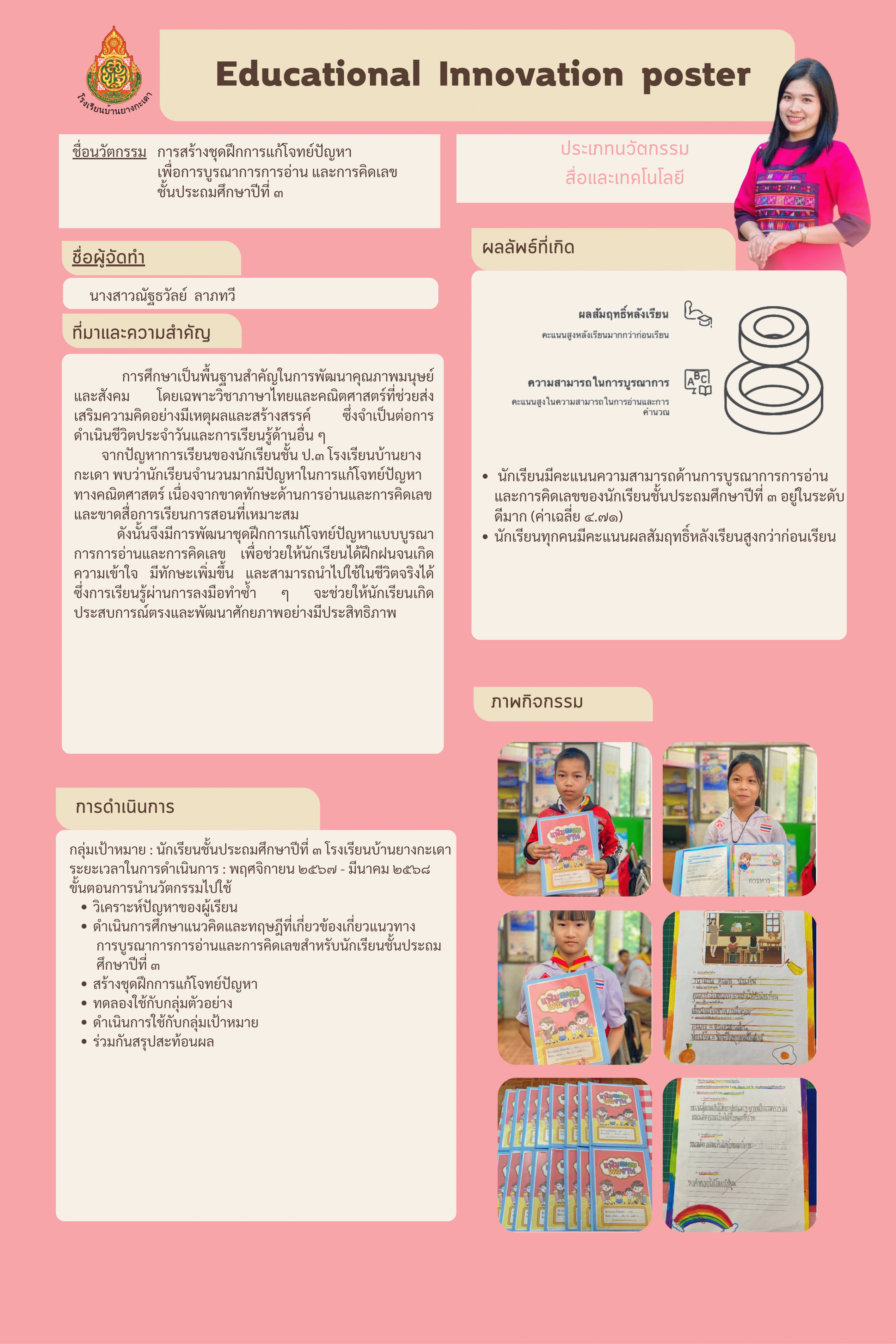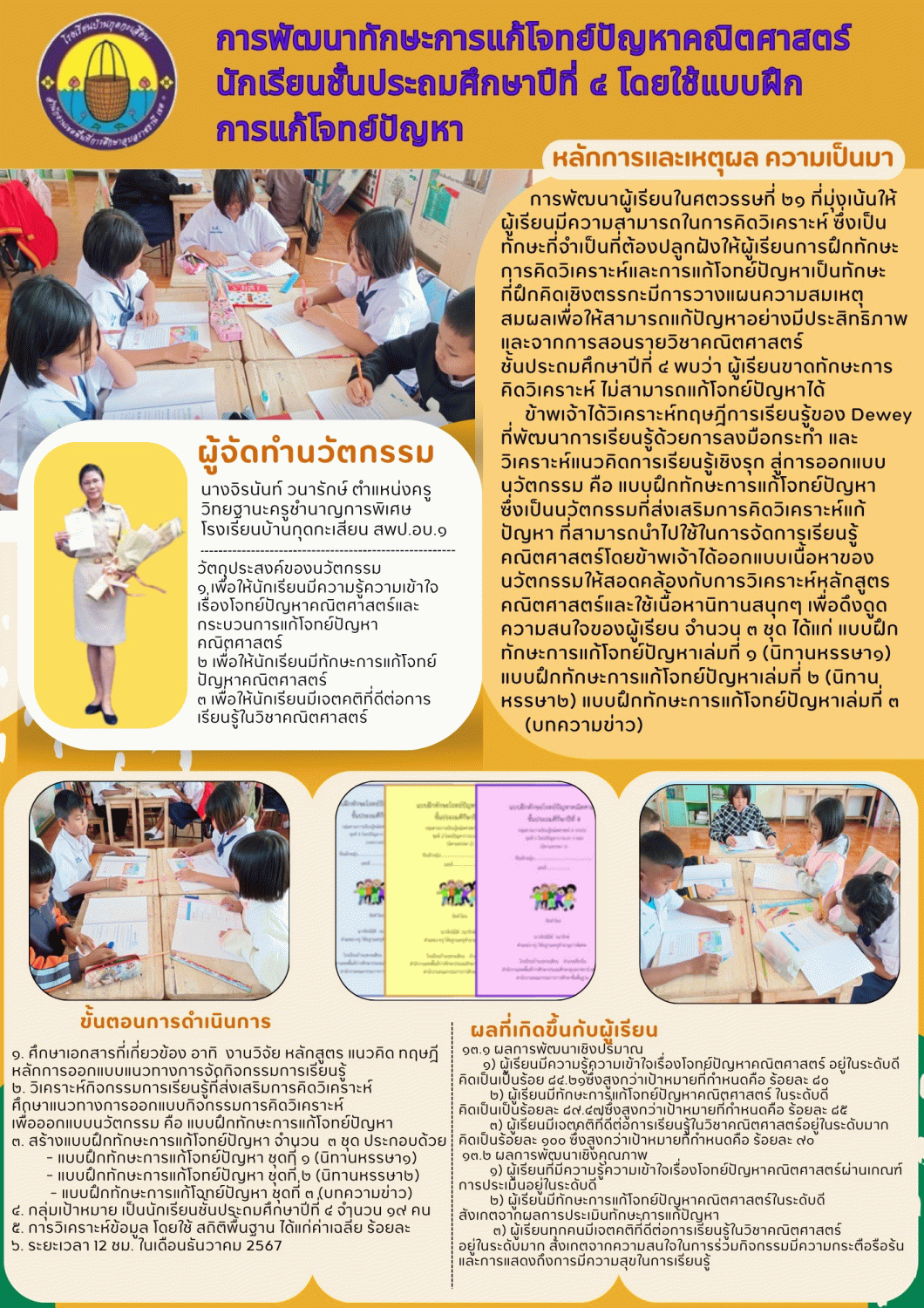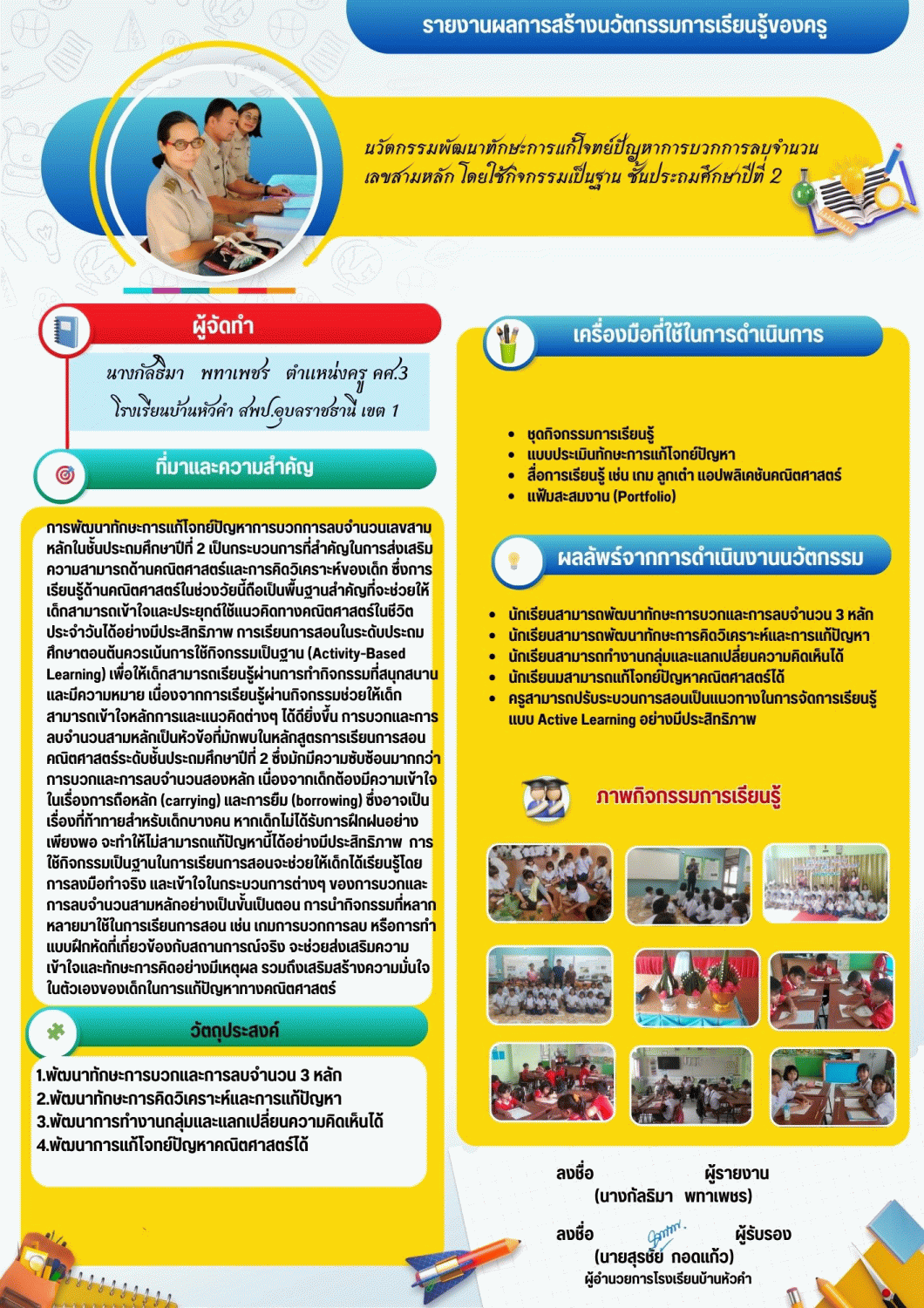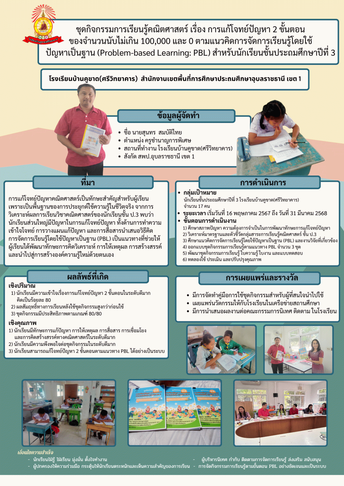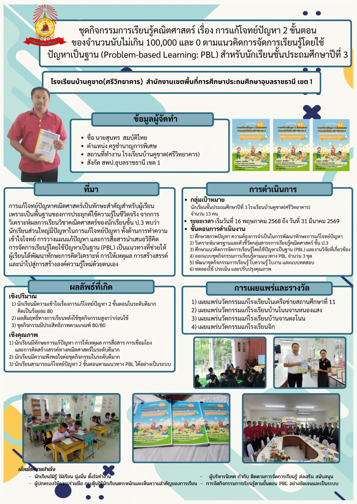 ชุดกิจกรรมการเรียนรู้คณิตศาสตร์ เรื่อง การแก้โจทย์ปัญหา 2 ขั้นตอนของจำนวนนับไม่เกิน 100,000 และ 0 ตามแนวคิดการจัดการเรียนรู้โดยใช้ปัญหาเป็นฐาน (Problem-based Learning: PBL) สำหรับนักเรียนชั้นประถมศึกษาปีที่ 3]